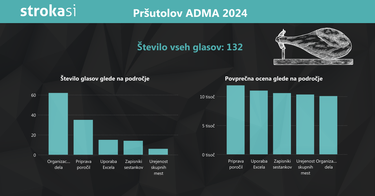 V sklopu nagradne igre na ADMA konferenci smo udeležence povprašali o opravilih, ki jim v delovnem dnevu vzamejo največ časa. Med možnostmi so bila opravila: uporaba Excela, organizacija dela, urejenost skupnih mest, priprava poročil in zapisniki sestankov. Med vsemi odgovori je največ udeležencev izpostavilo organizacijo dela, sledila je priprava poročil in uporaba Excela.