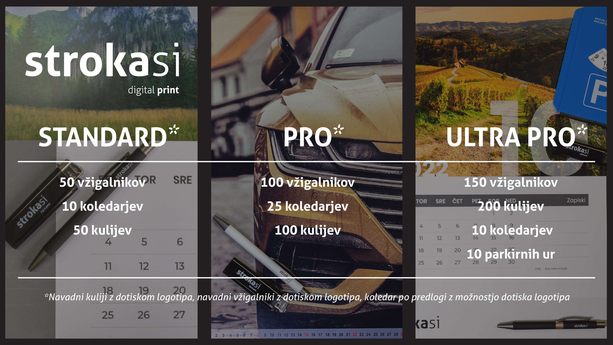 Storitve digitalnega tiska - predpraznična akcija promocijskih daril 5. nov. 2021 Novice Se ne želite znajti v situaciji, ko v zadnjih trenutkih pred prazniki panično iščete promocijska darila za partnerje, stranke ali zaposlene? Ker vam tega niti približno ne privoščimo, smo v našem oddelku za digitalni tisk za vas pripravili posebno praznično ponudbo! Zbrali smo potiskane izdelke, ki jih po naših izkušnjah podjetja najpogosteje podarjajo v sklopu prazničnih daril, in jih združili v paketih STANDARD, PRO in ULTRA PRO. Vse izdelke potiskamo v skladu z vašimi željami in celostno grafično podobo vašega podjetja. Več o tem, kaj vključujejo izbrani paketi, preverite na spodnji fotografiji. To pa še ni vse! Na podlagi vaših idej vam lahko pripravimo tudi druga promocijska darila, ki bodo odsevala vrednote vašega podjetja, hkrati pa si jih bodo prejemniki zapomnili za zmeraj. Prav tako poskrbimo za izpostavitev na večjih površinah – jumbo plakatih, reklamnih tablah, avtografikah, roll-up stojalih in še celi vrsti oblik. Več o storitvah digitalnega tiska » Za naročila in vsa vprašanja smo vam z veseljem na voljo v zasebnem sporočilu, na telefonski številki 070 720 066 ali e-naslovu ccc@stroka.si. Poglobite svoje znanje: Related articles Še nimate novoletnih daril? Mi imamo rešitev. HACKATHON - Kreativnica22 Kakovosten tisk na vse vrste tekstila - hitro in enostavno